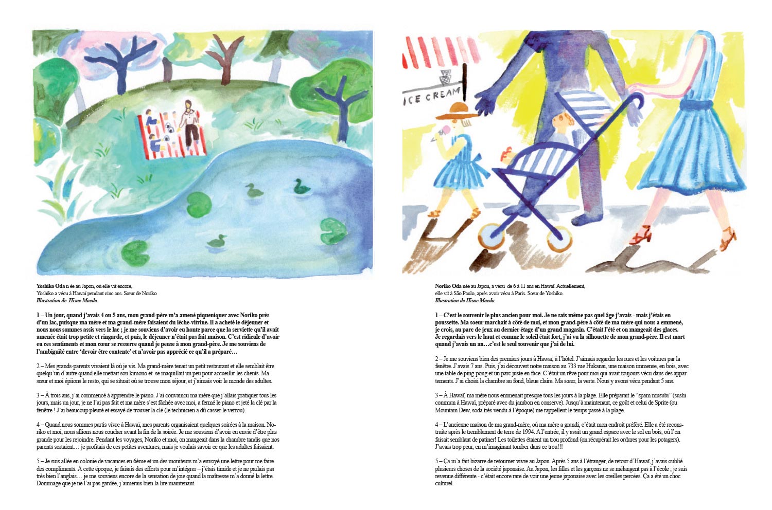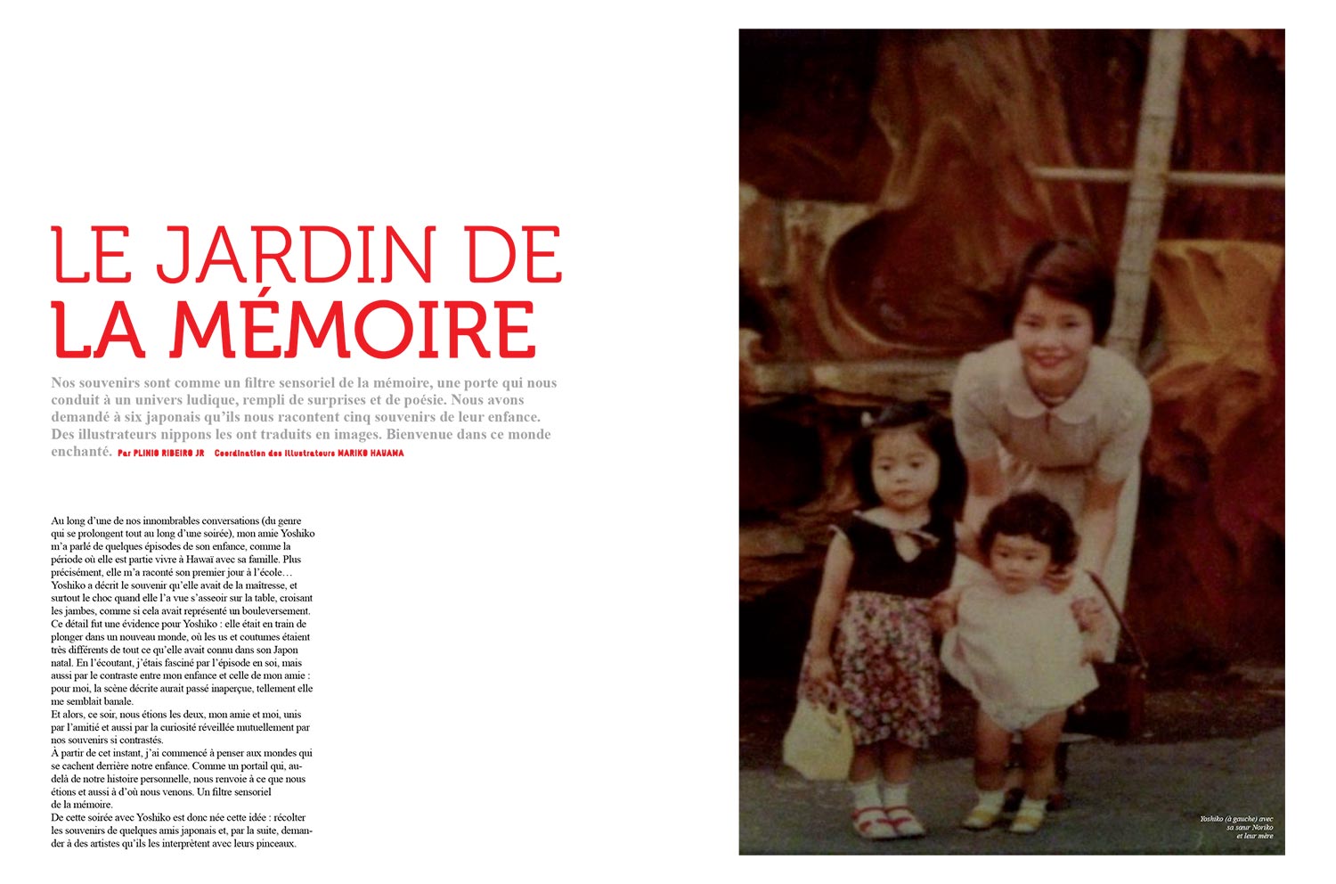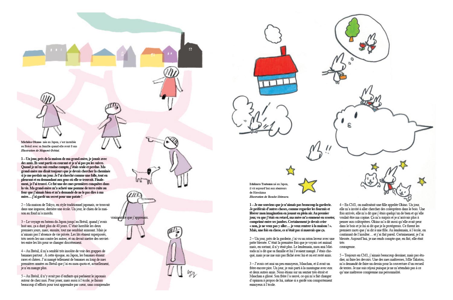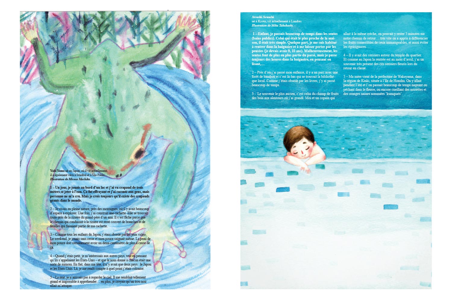 Se souvenir c’est voyager dans une monde sensoriel; c’est transformer le temps en une matière sensible que l’on manie tel un kaléidoscope. À partir de cette perception – la mémoire perçue comme un pont entre le présent et l’arche de souvenirs que nous habite – l’auteur a esquissé un portrait ludique du Japon en ayant comme matière première des souvenirs d’enfance récoltés auprès de Japonais(es) que, par la suite, ont été interprétés par des illustrateurs, également japonais.